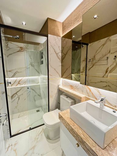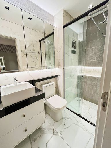 Banheiros com armários e box de vidro