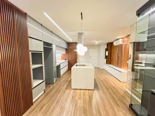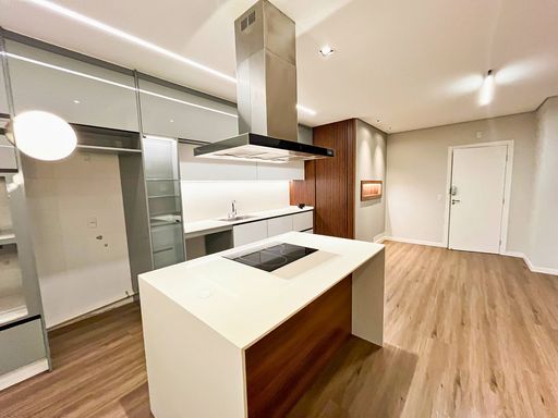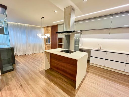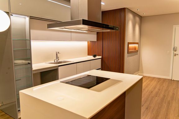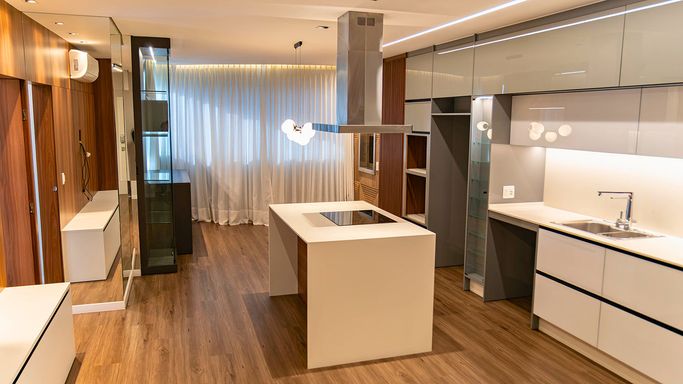 Cozinha semi mobiliada, com móveis planejados e bancada em granito